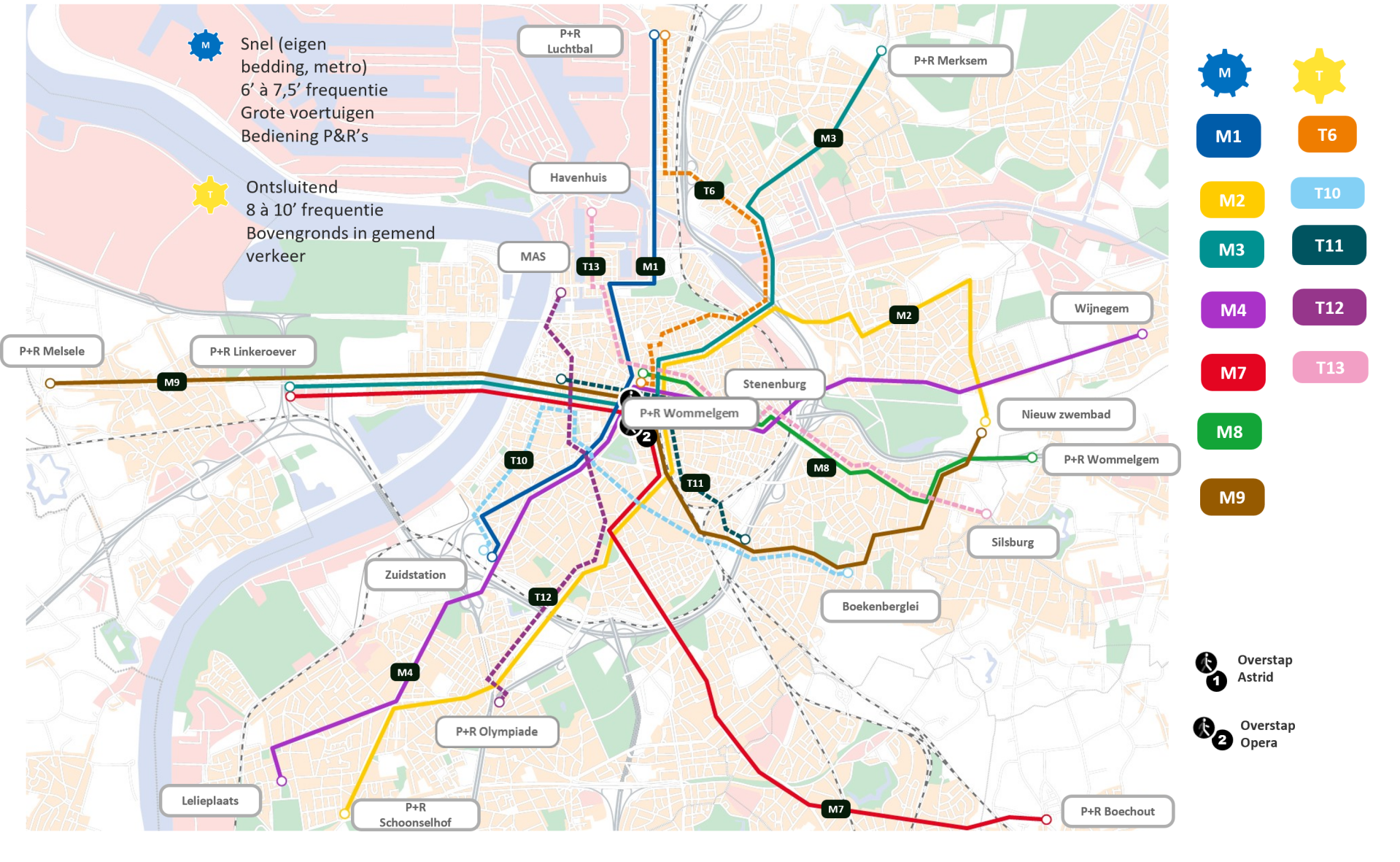 In 2021 werd het eerste voorstel voor de hertekening van het Antwerpse tramnet voorgesteld. Het plan combineerde sneltrams (M-lijnen) en stadstrams (T-lijnen), met een frequentie van respectievelijk elke 6 à 7 minuten en elke 10 minuten.