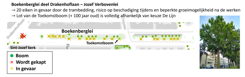 De stad zou intussen wel extra middelen voorzien voor het beschermen van de oude eiken op de Boekenberglei, maar de kans bestaat dat deze bomen de werken, of de gevolgen ervan, alsnog niet overleven: de trambedding zal dicht bij de wortels worden aangelegd, de trillingen van de voorbijrijdende trams kunnen de wortels beschadigen en er op termijn voor zorgen dat grond steeds vaster wordt en uiteindelijk nog weinig water doorlaat. De traminfrastructuur zal er ook voor zorgen dat de bomen aanzienlijk teruggesnoeid moeten worden.