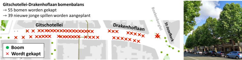 Op de Gitschotellei-Drakenhoflaan verdwijnen alle bestaande bomen. In totaal zullen 62 bomen gerooid worden. Daarnaast wordt 67 vierkante meter van het Te Boelaerpark ontbost. De nieuwe aanplantingen die dit groenverlies moeten compenseren zullen pas binnen tientallen jaren hetzelfde verkoelende effect hebben als de bestaande bomen – als hun groei optimaal verloopt en de nieuwe aanplantingen niet afsterven (zoals helaas wel ieder jaar gebeurt op de Boekenberglei). Met het rooien van nagenoeg alle bomen op de Gitschotellei-Drakenhoflaan verdwijnt ook voorgoed de beeldbepalende groene corridor tussen het Te Boelaerpark en het Boekenbergpark.